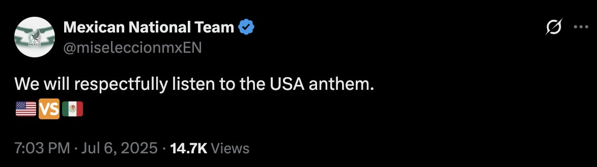 On the 6th of July at NRG Stadium in Houston, Texas, things went off to a gracious start. There weren’t the mutual sneers, boos, and jeers over the opposition’s national anthems as there were at the U.S.-Canada ice-rinks following the Trump-Trudeau tariff war. Not at all, as a matter of fact, shortly before the match, the Mexican National Team posted on X requesting that all Mexican supporters in the stadium remain silent during the U.S. national anthem. Red, white, and blue supporters were happy to reciprocate. This was the first glimpse that would foretell the mood of the match and how it would ensue.